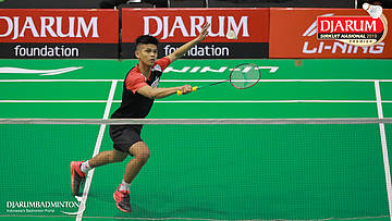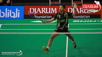 Daniel Ari Wibisono Setio (Sarwendah Badminton Club, Jaktim) menyambut shuttlecock