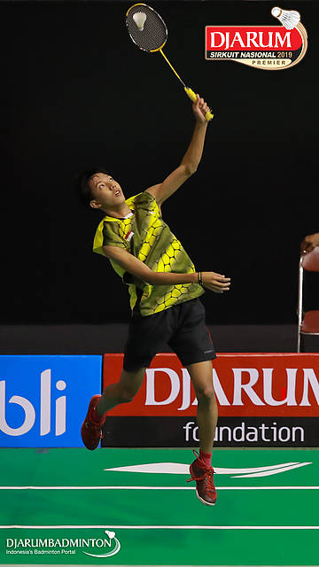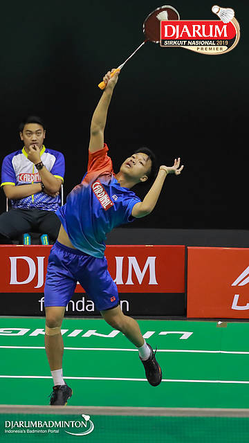 Aldy Firmanda (PB Djarum, Kudus) melepaskan serangan