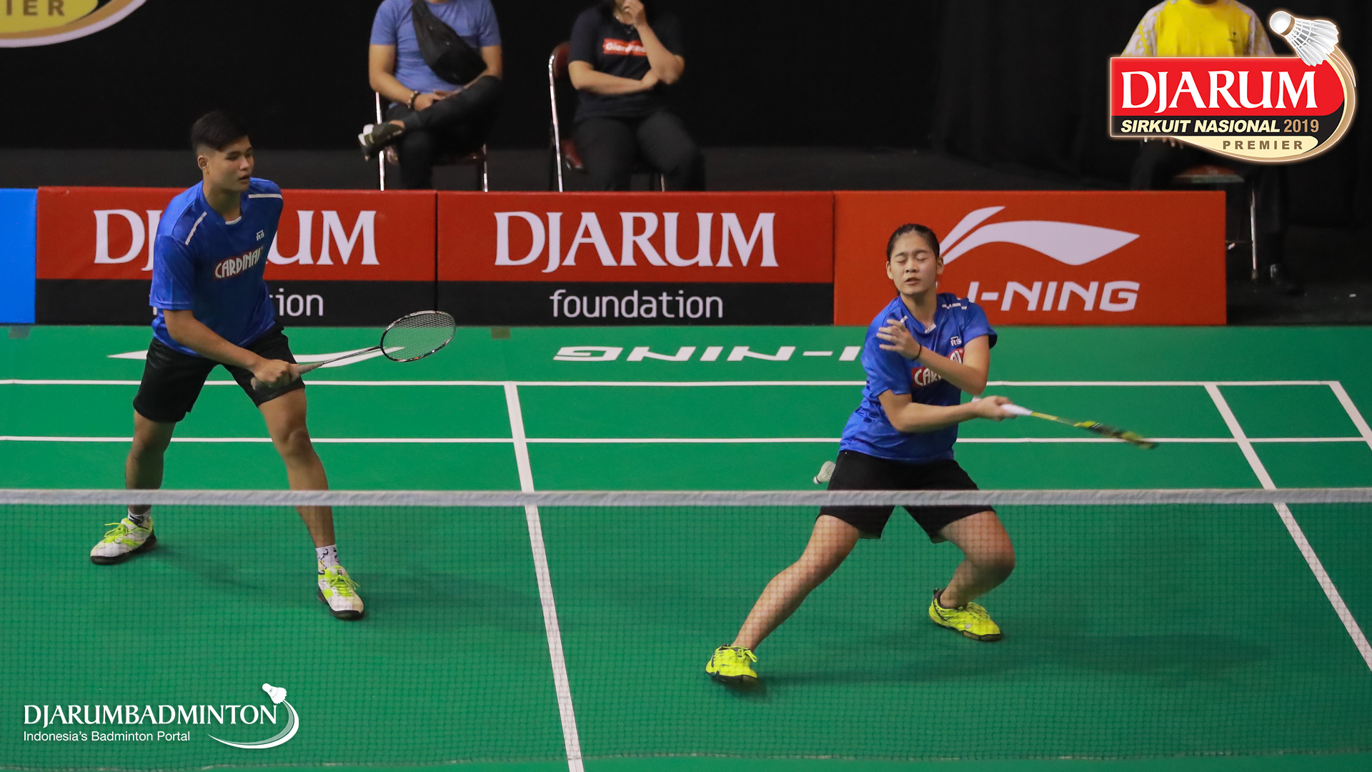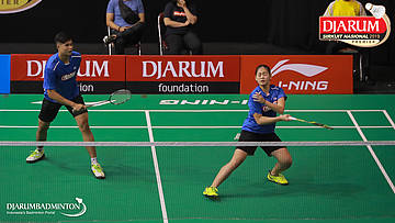 Yoggi Pamungkas+Aldira Rizki Putri (PB Djarum, Kudus) mengembalikan shuttlecock