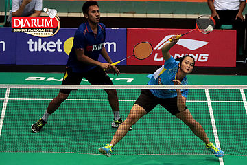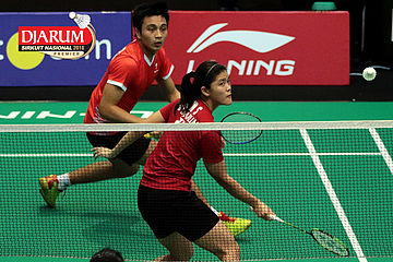 Zachariah Josiahno/Serena Kani (Tangkas Intiland/PB Djarum Kudus) Mengembalikan Shuttlecock