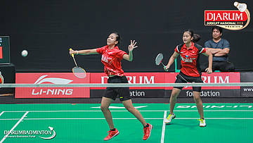 Amalia Cahaya Pratiwi+Metya Inayah Cindiani (Pelatnas PBSI) mengembalikan shuttlecock