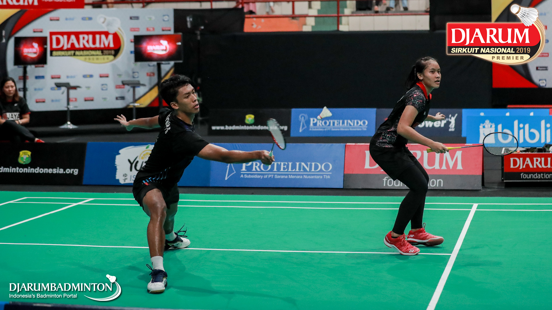 Moh Rezky Alfarez+Denisa Dwi Syawaliah Budiani (Sekolah Khusus Olahraga Ragunan+Jaya Raya Jakarta) bersiap menyambut serangan