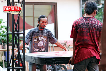Dua Pekerja Sedang Menggotong Atribut Booth Merchandise Djarum Sirkuit Nasional Li-Ning Premier Jawa Timur Open.