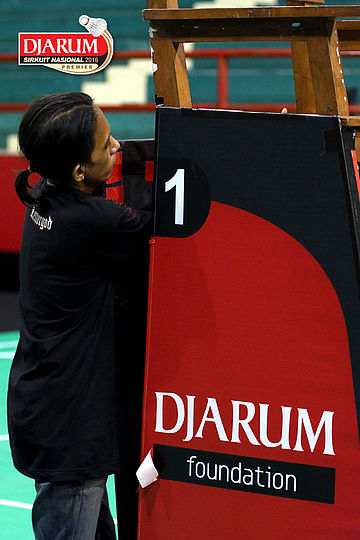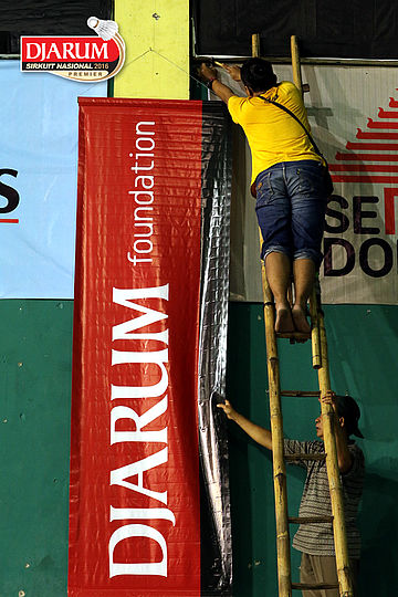 Seorang Pekerja Terlihat Mengatur Dekorasi Djarum Sirkuit Nasional Li-Ning Premier Jawa Timur Open 2016.