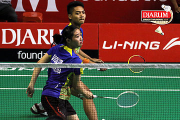 Fernando Kurniawan/Dian Fitriani (Djarum Kudus/Pertamina Fastron) Mengembalikan Shuttlecock.