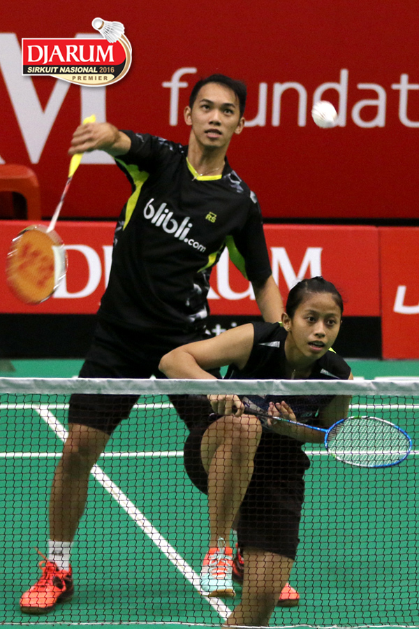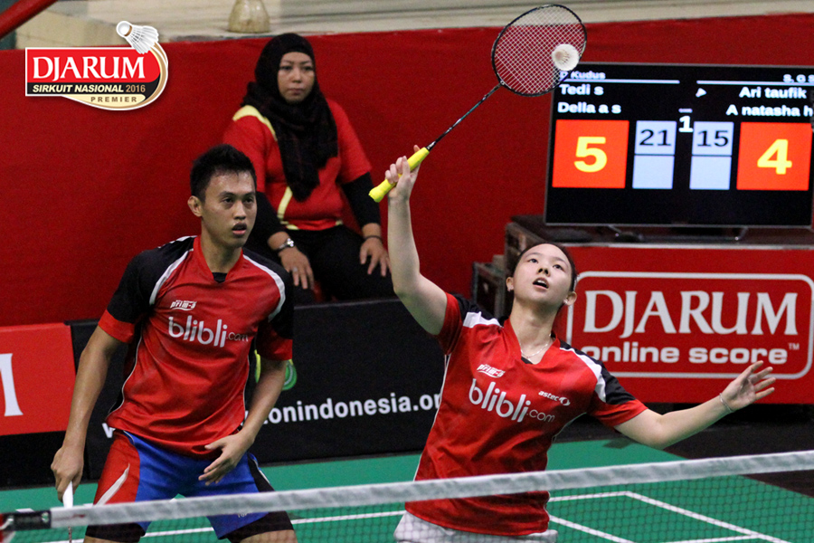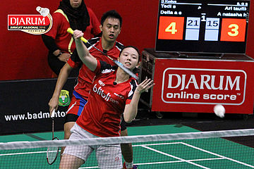 Tedi Supriadi/Della Augustia (Djarum Kudus) Menghadang Serangan.