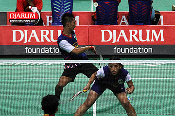 Reza Dwicahya/Tutut Novi (Jaya Raya) bersiap menyambut pengembalian