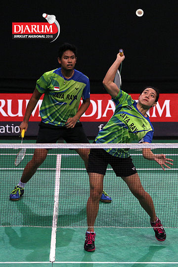 Irfan Fadhillah/Weni Anggraeni (Jaya Raya) bersiap menyambar pengembalian tanggung