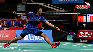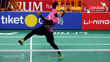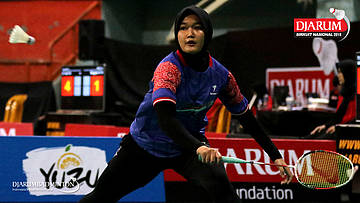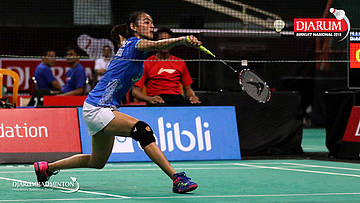 Savira Sandradewi (PB Djarum Kudus) bersiap menghadang serangan