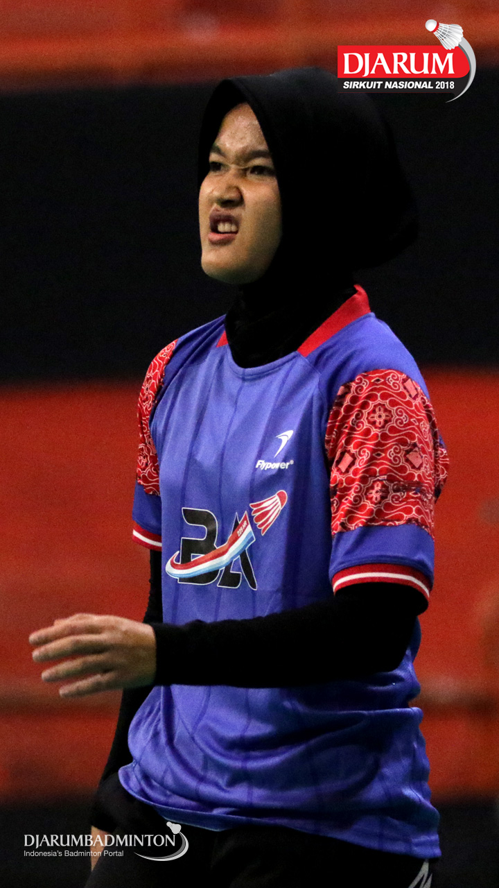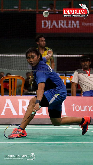 Isra Faradilla (Indojaya Kendari) mengembalikan shuttlecock