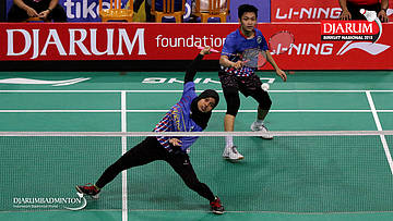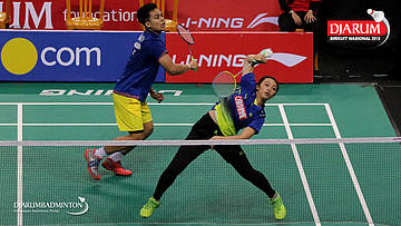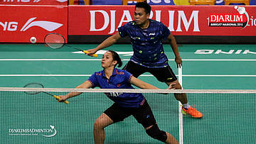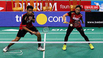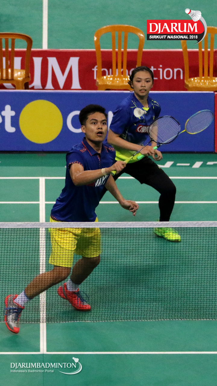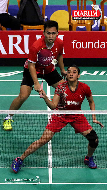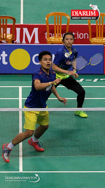 I Kadek Pande Dheva Brahmantya Putra/Sintia Dewi Yuliani (PB Djarum Kudus) bersiap menghadang serangan