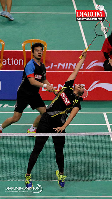 Reza Dwicahya Purnama/Annisya Widya Permatasari (Jaya Raya Jakarta/Mutiara Cardinal) bersiap menyambar pengembalian