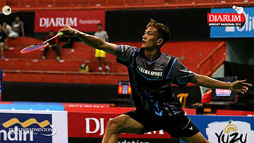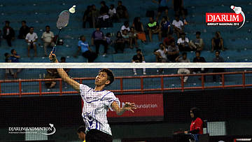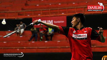 Bagas Kristianto Nugroho (PB Djarum Kudus) mengembalikan shuttlecock