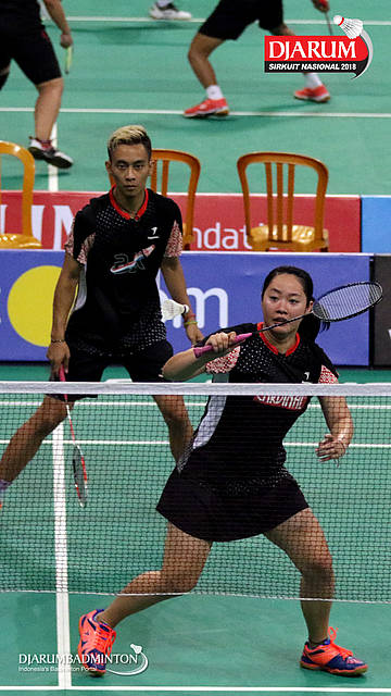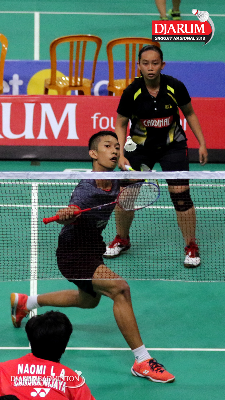 Aldi Efendi/Dianita Saraswati (Telkom Bandung/Mutiara Cardinal) mengembalikan shuttlecock