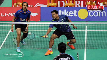 Agripina Primarahmanto Putera/Tiara Rosalia Nuraidah (Berkat Abadi/Mutiara Cardinal) bersiap menyambut pengembalian