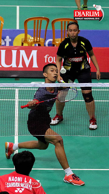 Reza Dwicahya Purnama/Annisya Widya Permatasari (Jaya Raya Jakarta/Mutiara Cardinal) mengembalikan shuttlecock