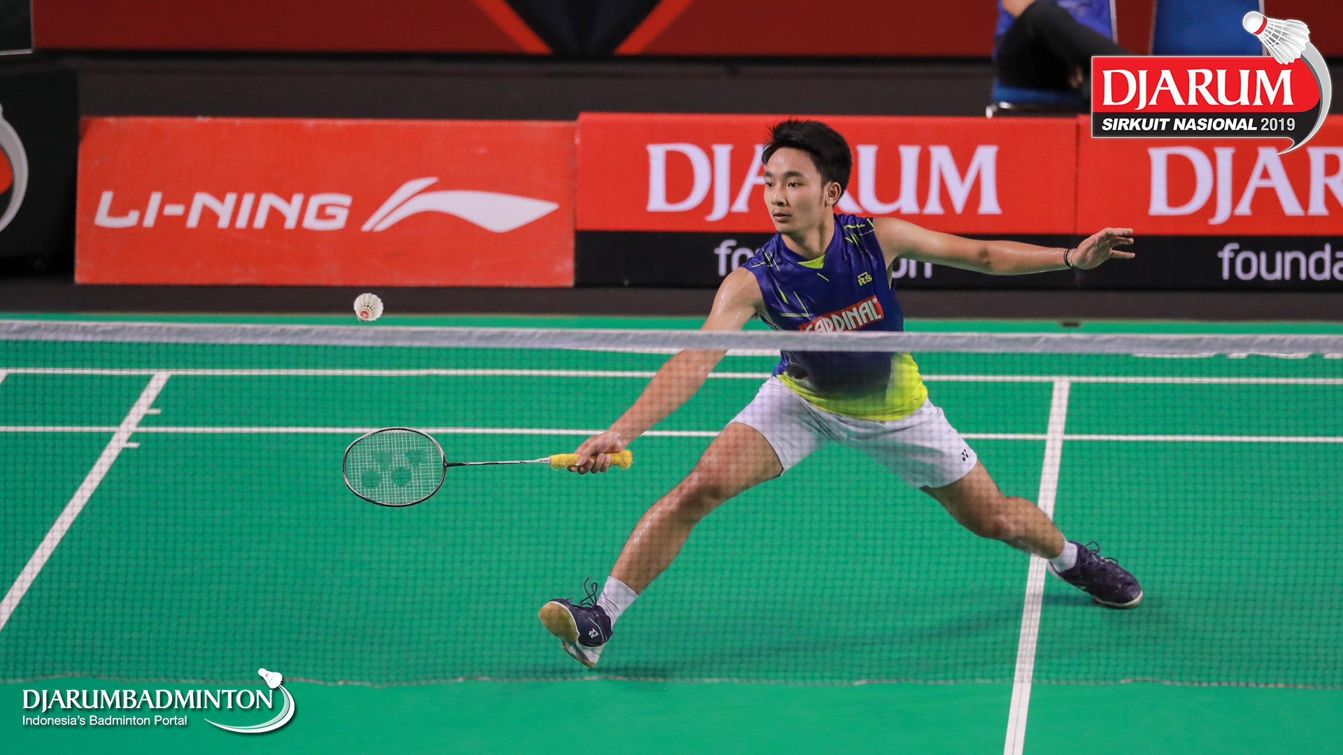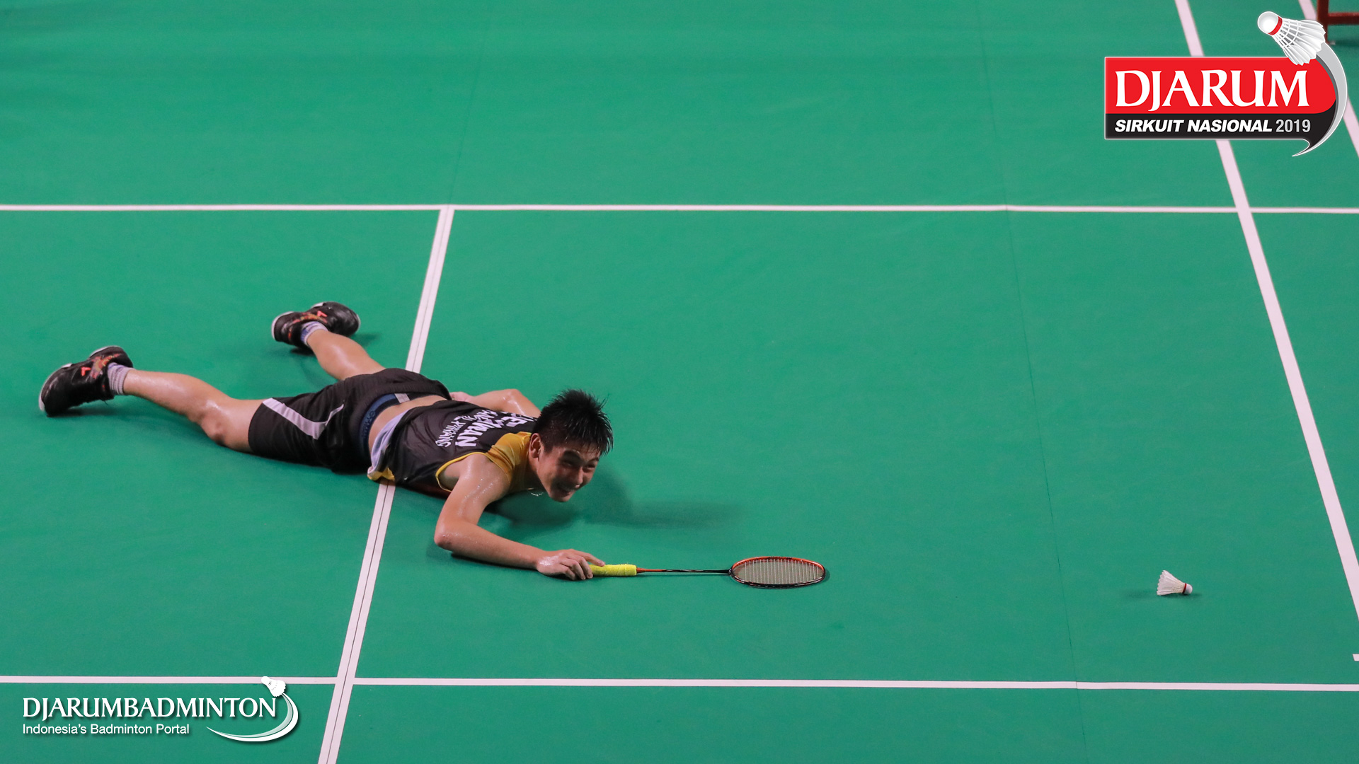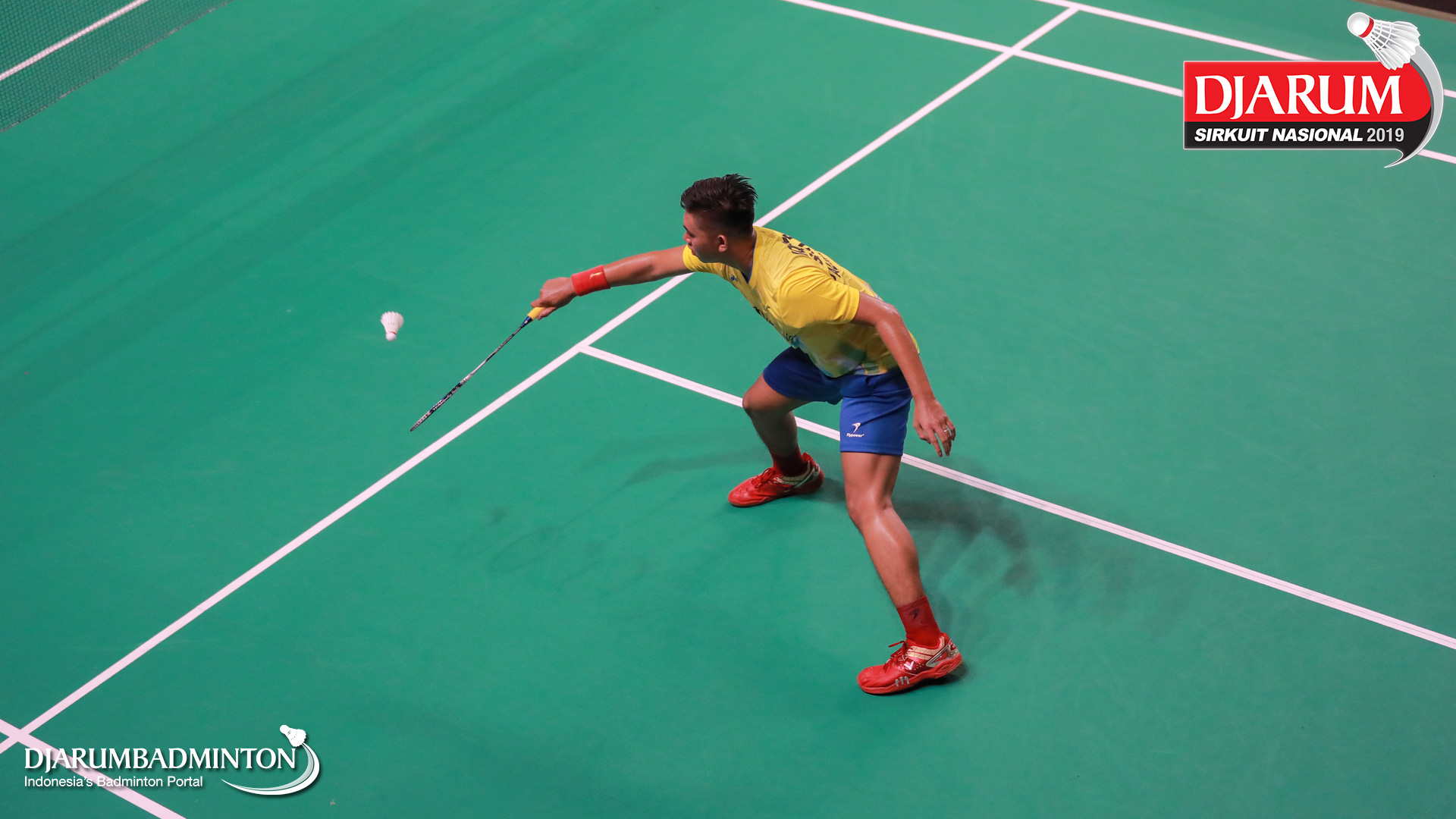 Josia Setiawan (RAJAWALI BADMINTON CENTER) terjatuh saat berusaha menyambut shuttlecock