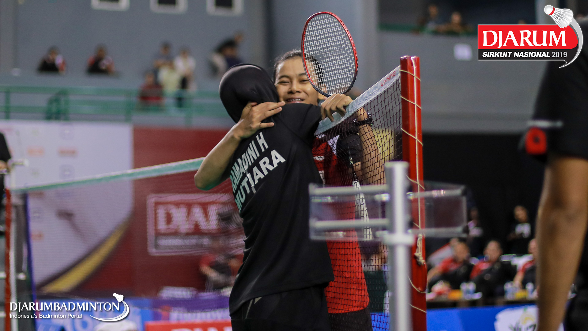 Hanna Ramadini (Mutiara Cardinal, Bandung) dan Dinar Dyah Ayustine (PB Djarum, Kudus) berpelukan seusai bertanding