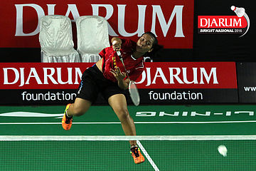 Senatria Agus/Gebby Ristiyani (SGS PLN/Mutiara Cardinal) bersiap menyambar pengembalian tanggung.