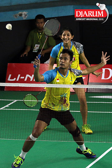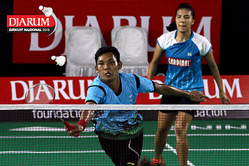 Wahyu Triansyah/Melvira Oklamona (Bank Sumsel Babel/Mutiara Cardinal) menyambar pengembalian.