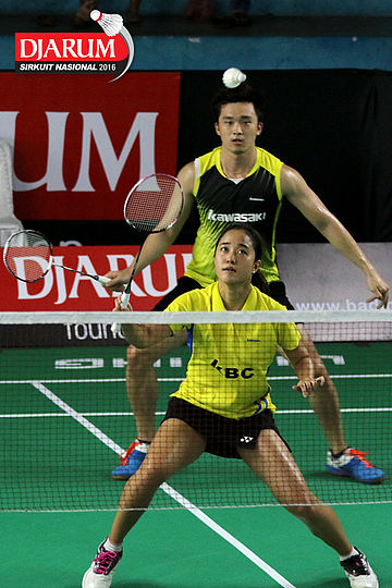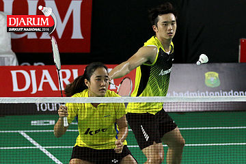 Loke Kok Pong/Millicent Wiranto (Malaysia/Sutomo) mengembalikan shuttlecock.