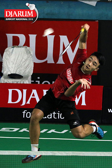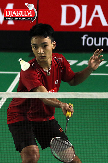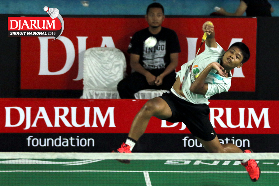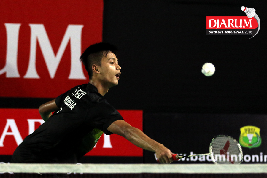 Noval Ramadhan (Djarum Kudus) mengembalian shuttlecock.
