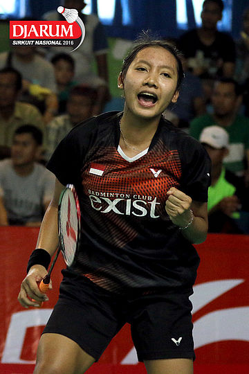 Ekspresi Bening Sri Rahayu (Exist) saat berhasil mencetak poin.