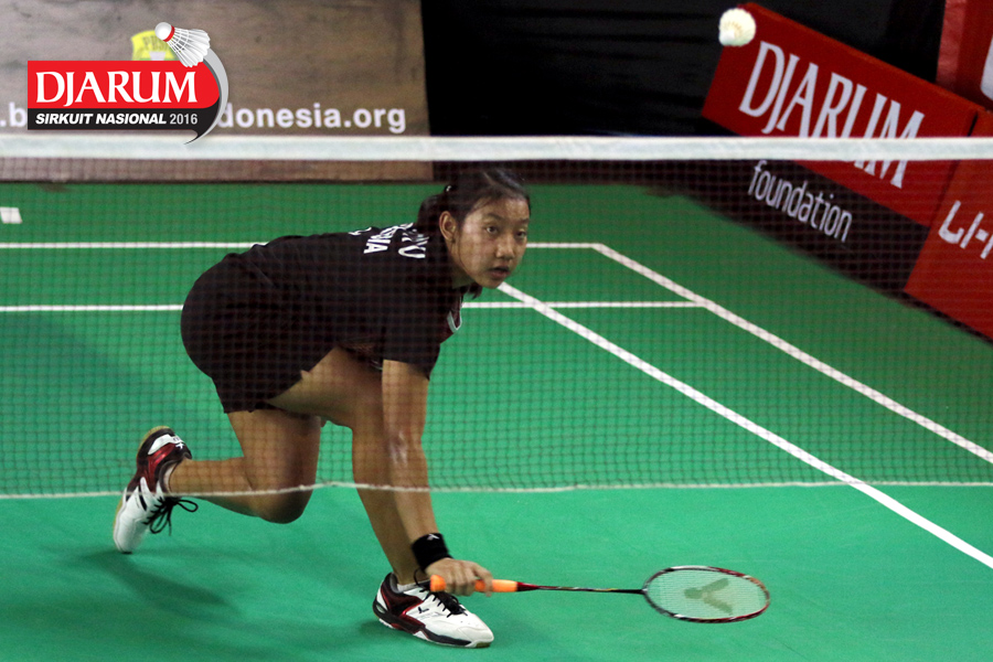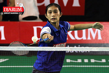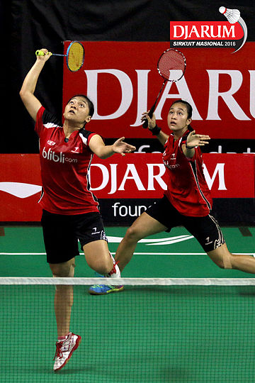 Indah Cahya/Lisa Ayu (Djarum Kudus) bersiap menyambar pengembalian.