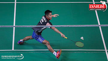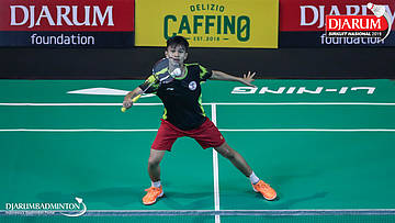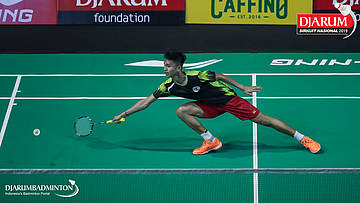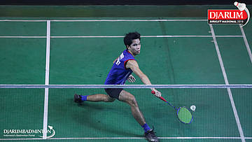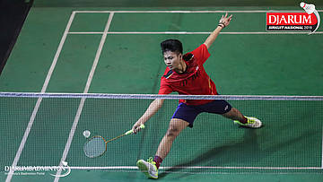 Gabriel Vincenzo Aprilio Tewuh (Bhayangkara Manado) berusaha menggapai shuttlecock