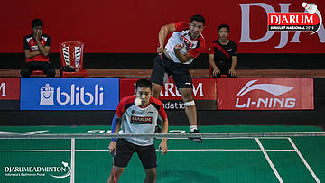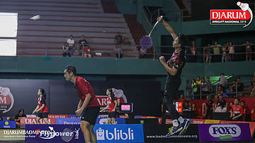 Calvin Kristanto+Hendra Gustiawan (PB Djarum, Kudus) melepaskan serangan