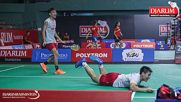 Michael Kaldrian Wiguna+Swiking Imanuel Wuisan (Daihatsu Candra Wijaya) terjatuh saat berusaha menggapai pengembalian