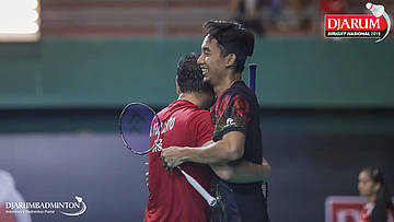 Selebrasi kemenangan Alvent Yulianto Chandra+Rian Agung Saputro (PB Specta Badminton Club+Berkat Abadi, Banjar)