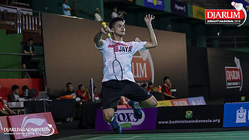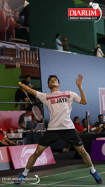 Athadhia Ramadhan Rizal (Jaya Raya Jakarta) bersiap mengembalikan shuttlecock