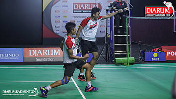Ghana Muhammad Al Ilham+Mochamad Rafi Rizqi Kurniawan (PB Djarum, Kudus) berusaha menggapi pengembalian
