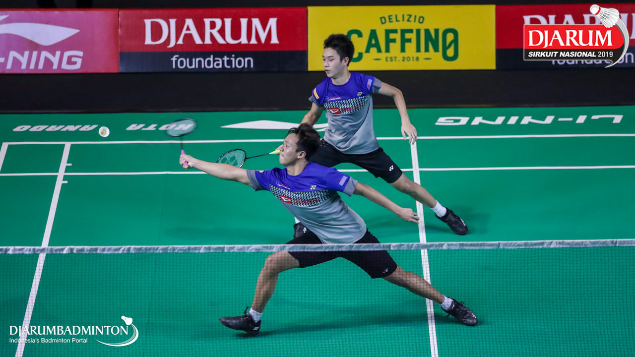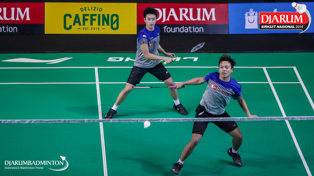 Ghana Muhammad Al Ilham+Mochamad Rafi Rizqi Kurniawan (PB Djarum, Kudus) menyambut shuttlecock