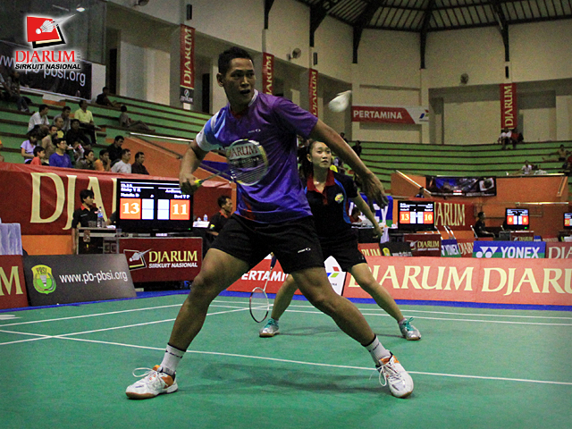 Pasangan ganda campuran PB Djarum/PB Tangkas Alfamart, Rizky Yanu K/Natalia Deske berusaha mengembalikan kok ke arah pasangan Ardiansyah Putra/Devi Tika Permatasari dalam babak penyisihan ganda dewasa campuran Djarum Sirkuit Nasional Bali