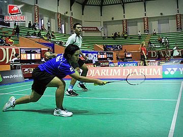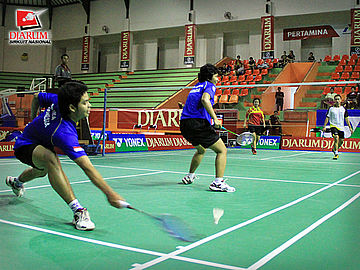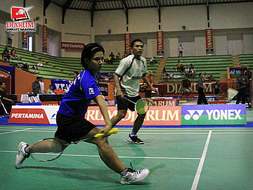 Pemain asal PB. PERTAMINA, Prima Khasna Putra /Siti Sarah S berusaha mengembalikan kok ke arah pemain PB. Jaya Raya Jakarta/PB. Jaya Raya Suryanaga, Lita Nurlita/ Tri Kusuma Wardhana dalam babak kualifikasi ganda dewasa campuran Djarum Sirkuit Nasional