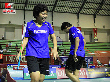 Ekspresi pemain PB. PERTAMINA, Prima Khasna Putra /Siti Sarah S ketika menghadapi pemain PB. Jaya Raya Jakarta/PB. Jaya Raya Suryanaga, Lita Nurlita/ Tri Kusuma Wardhana dalam babak kualifikasi ganda dewasa campuran Djarum Sirkuit Nasional Bali