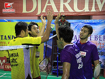 Pemain PB Djarum, Rendra Wijaya/Rian Sukmawan (kiri) bersalaman dengan pemain PB Djarum, Fernando K./Wifqi Windarto setelah menyelesaikan babak final ganda dewasa putra Djarum Sirkuit Nasional Makassar di GOR Sungguminasa, Gowa, Sabtu (22/10).