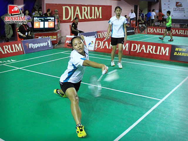 Pemain Pusdiklat Jaya Raya, Eri Oktavinai/Rizky Amelia berusaha mengembalikan kok ke arah pemain SGS Elektrik PLN, Keshya Nurvita/Devi Tika P. dalam babak final ganda dewasa putri Djarum Sirkuit Nasional Makassar di GOR Sungguminasa, Gowa, Sabtu (22/10).