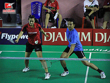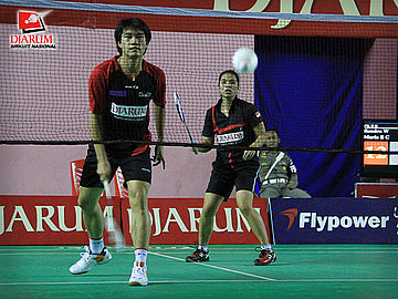 Pemain PB Ganesha Islamic Village/SGS Elektrik PLN, Ardiansyah/Devi Tika P. mengembalikan kok ke arah pemain PB Pertamina Indonesia, Iksawan In./Novita G. dalam babak penyisihan ganda dewasa campuran Djarum Sirkuit Nasional Makassar di GOR Sungguminasa