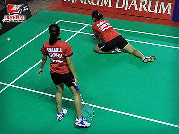 Pemain PB Djarum, Erlina K./Rena A. terjatuh saat ingin mengembalikan kok ke arah pemain Semen Gresik, Agisna/ Marshella G dalam babak penyisihan ganda remaja putri Djarum Sirkuit Nasional Makassar di GOR Sungguminasa, Gowa, Selasa(18/10).