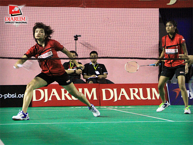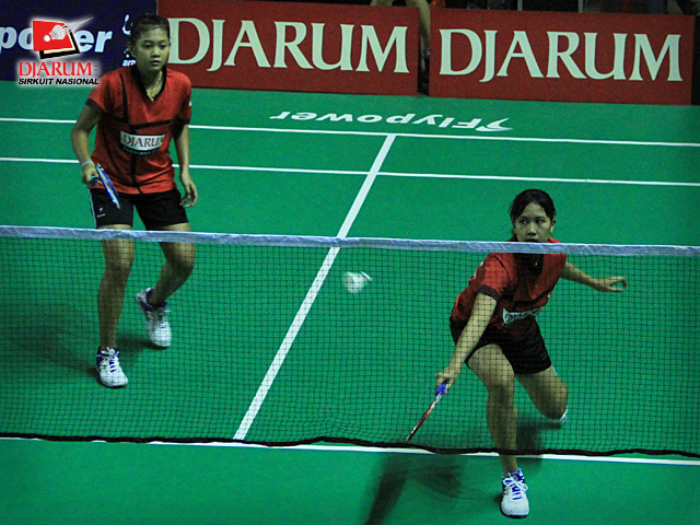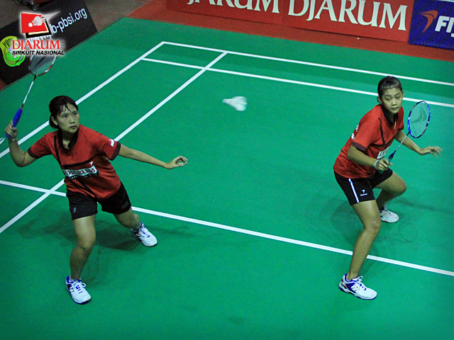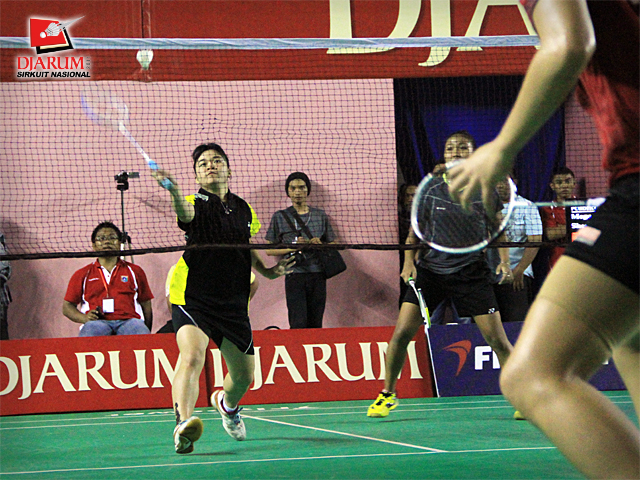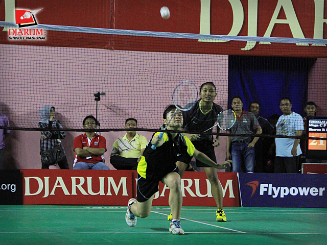 Pemain PB Djarum, Farah Amalia T/Gilbertha A. berusaha mengembalikan kok ke arah pemain Pusdiklat Jaya Raya/Pelatprov DKI, Mega Cahya P./Sheren Regina N. dalam babak penyisihan ganda remaja putri Djarum Sirkuit Nasional Makassar di GOR Sungguminasa