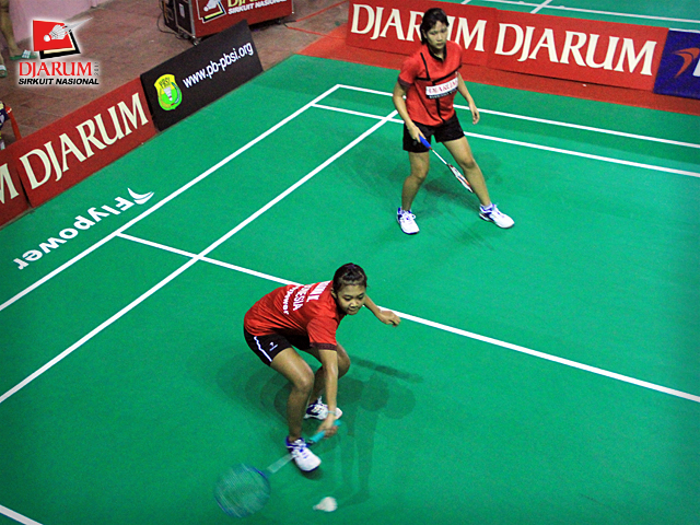 Pemain Pusdiklat Jaya Raya/Pelatprov DKI, Mega Cahya P./Sheren Regina N berusaha mengembalikan kok ke arah pemain PB Djarum, Farah Amalia T/Gilbertha A.. dalam babak penyisihan ganda remaja putri Djarum Sirkuit Nasional Makassar di GOR Sungguminasa