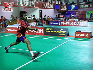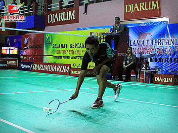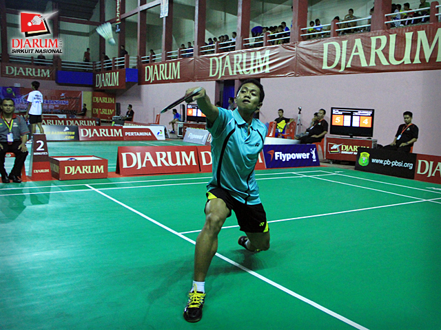 Pemain PB. Fila Watch Makassar, Chairil Anwar berusaha mengembalikan kok ke arah pemain Pusdiklat Jaya Raya, Imam Adi Kusuma dalam babak penyisihan tunggal remaja putra Djarum Sirkuit Nasional Makassar di GOR Sungguminasa , Gowa, Senin (17/10).