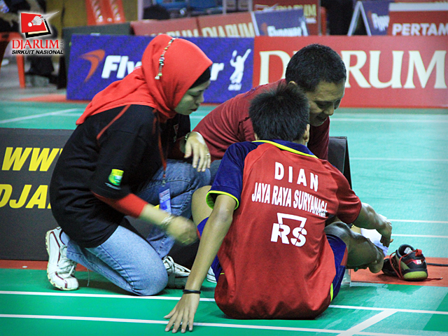Pemain PB. Jaya Raya Suryanaga, Dian Hadi S mengalami cidera saat berhadapan dengan Platprov PBSI DKI Jakarta, Muhammad Nizar dalam babak penyisihan tunggal remaja putra Djarum Sirkuit Nasional Makassar di GOR Sungguminasa, Gowa, Senin (17/10).