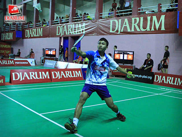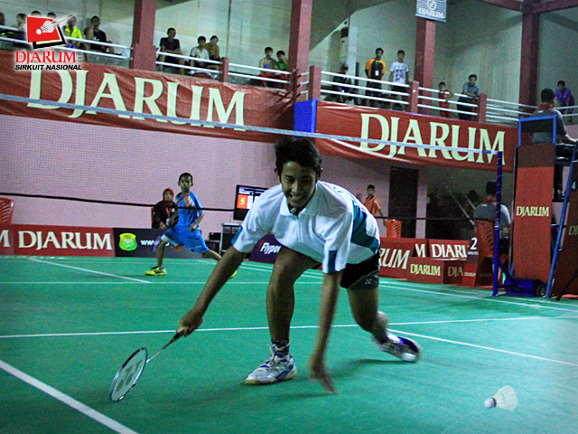 Pemain Pusdiklat Jaya Raya, Imam Adi Kusuma berusaha mengembalikan kok ke arah pemain PB. Fila Watch Makassar, Chairil Anwar dalam babak penyisihan tunggal remaja putra Djarum Sirkuit Nasional Makassar di GOR Sungguminasa, Gowa, Senin (17/10).