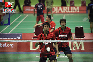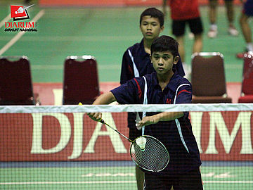 Deandra Fatwaka dan Yoga Sidik (Pelatprov DKI Jakarta) dalam babak penyisihan Ganda Remaja Putra Djarum Sirkuit Nasional (Sirnas) Pangkalpinang