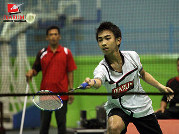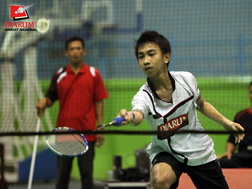 Yoga Sidik (Pelatprov DKI Jakarta) berusaha memukul kok ke arah lawan di babak penyisihan Tunggal Remaja Putra Djarum Sirkuit Nasional (Sirnas) Pangkalpinang