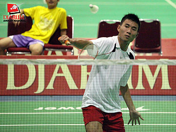 Willy Sim (PB Shamrock) berusaha mengembalikan kok ke arah lawan di babak penyisihan Tunggal Dewasa Putra Djarum Sirkuit Nasional (Sirnas) Pangkalpinang